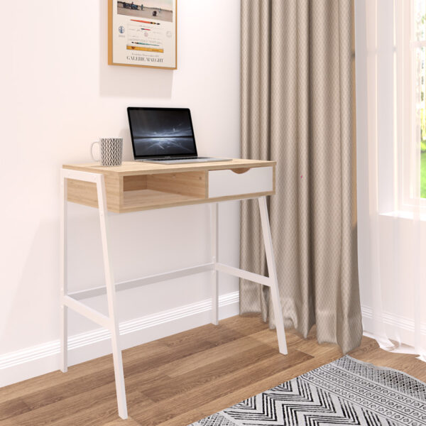 Γραφείο εργασίας Rezio pakoworld με ράφι και συρτάρι σε oak-λευκή απόχρωση με λευκό μεταλλικό σκελετό 75x45x76εκ. 375-000014